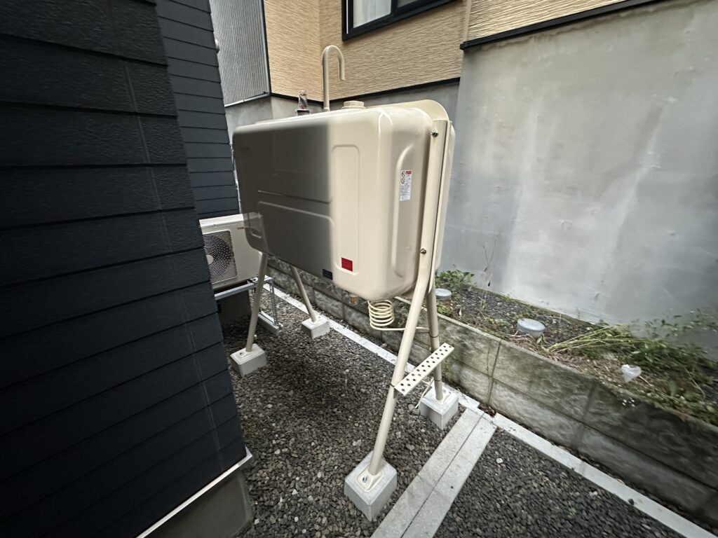 外には灯油タンクを設置して、室内には灯油ストーブを新設しました。