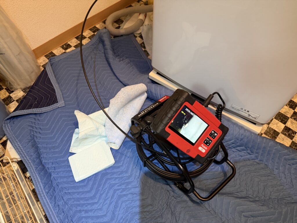 洗浄ホースと一緒にカメラを入れて管内を確認しながら作業。