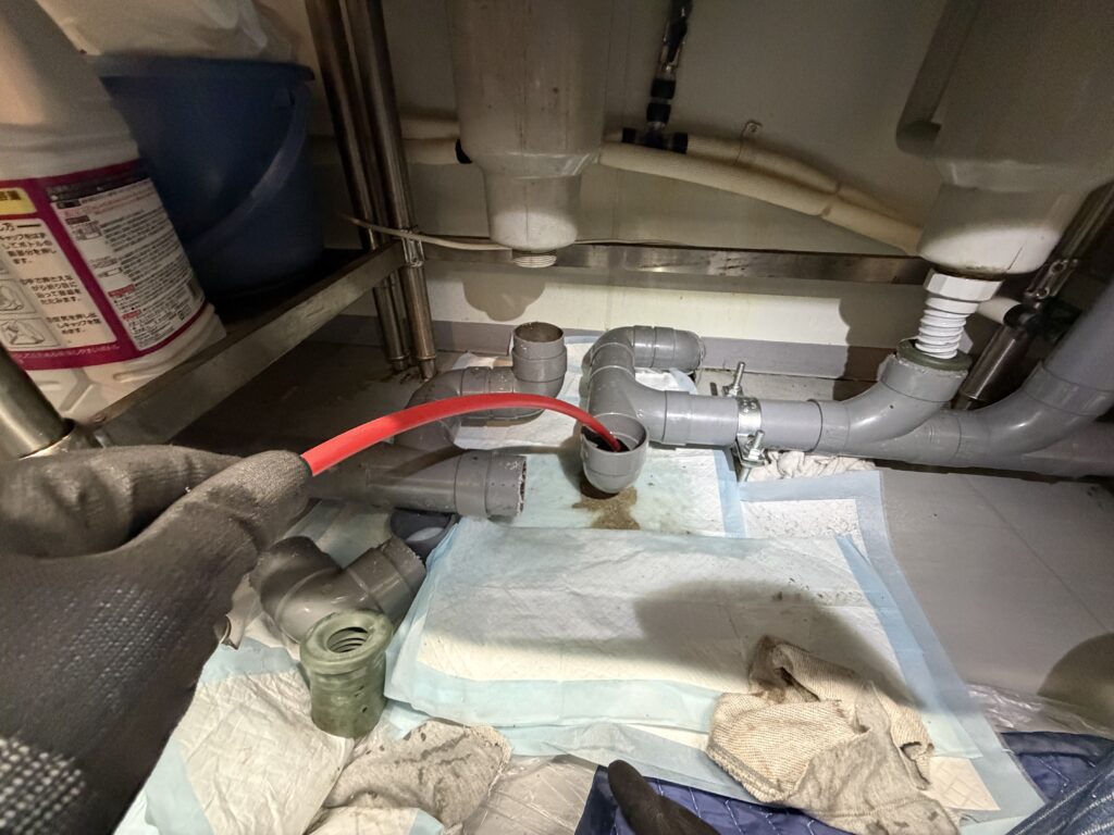 排水管を一度切断して中をしっかり清掃する方法を取りました。